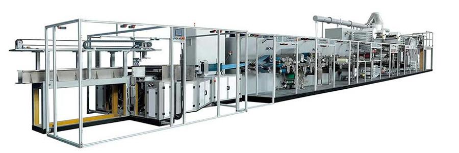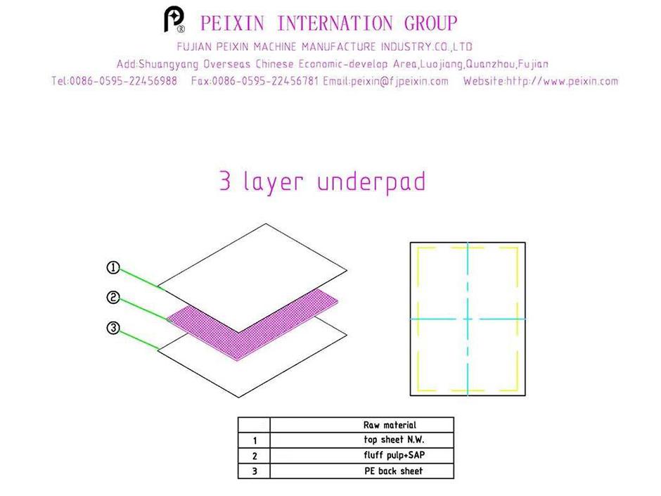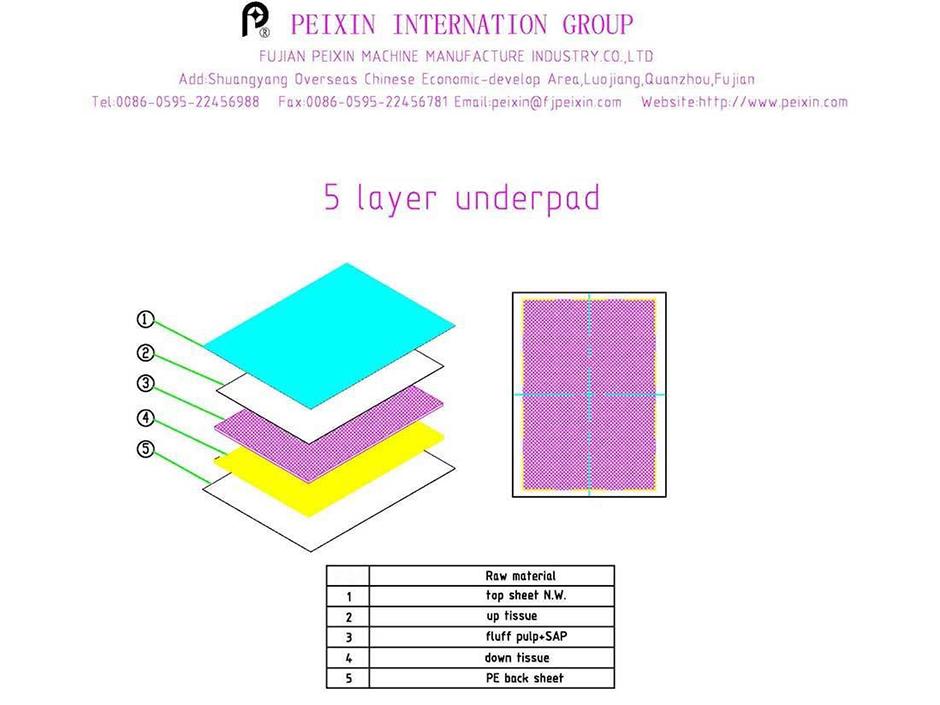 يمكن إنتاج أفرشة ضد الماء و فرش تدريب الكلب 3 طبقات ( طبقة PE، لب الزغب، قماش غير منسوج) أو 5 طبقات (طبقة PE، نسيج طبقة سفلية، لب الزغب، نسيج طبقة علوية، قماش غير منسوج)، بسرعة عالية.